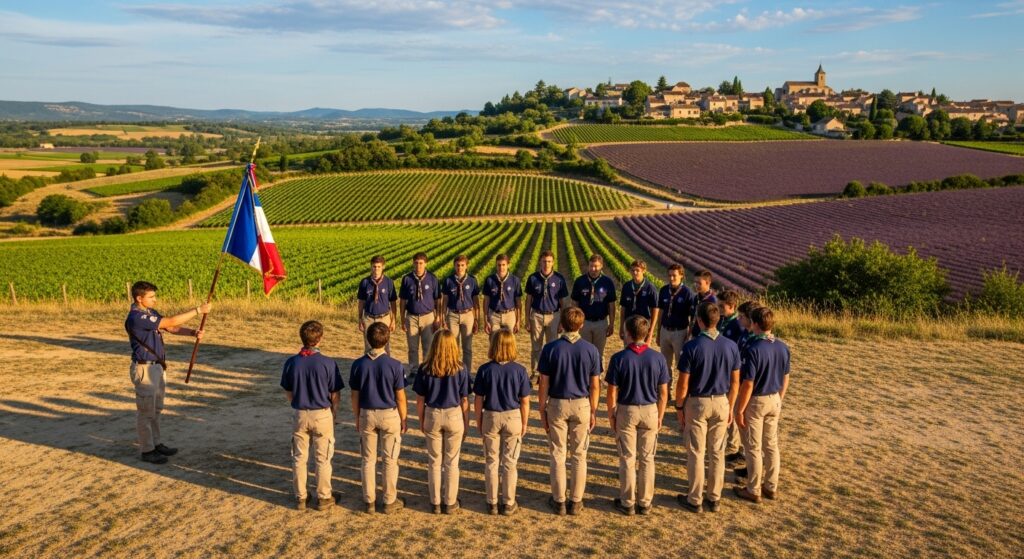 Nous invitons aussi les jeunes qui nous sont confiés à aimer leur pays, ce qui se manifeste en particulier dans la cérémonie du lever des couleurs chaque matin en camp, incluant le drapeau français, le drapeau européen et le drapeau des cadets. En hissant ces drapeaux, nous marquons le début d’une journée vécue ensemble, tournée vers le respect, l’effort et l’engagement. C’est une façon simple et digne de se rassembler et de rappeler ce que nous avons en commun, à commencer par le désir d’une société plus juste, plus fraternelle, plus responsable.