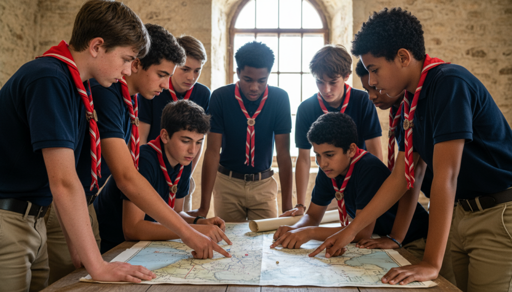 - A l’âge éclaireur ou éclaireuse, de 12 à 17 ans, les jeunes sont au sein d’une d’unités distinctes de garçons et de filles. Les éclaireurs et éclaireuses sont répartis en “équipages”, de 5 à 8 jeunes de 12 à 17 ans. Chaque équipage est placé sous la responsabilité d’un des membres de l’équipage, appelé capitaine, reconnu pour sa maturité et son expérience.